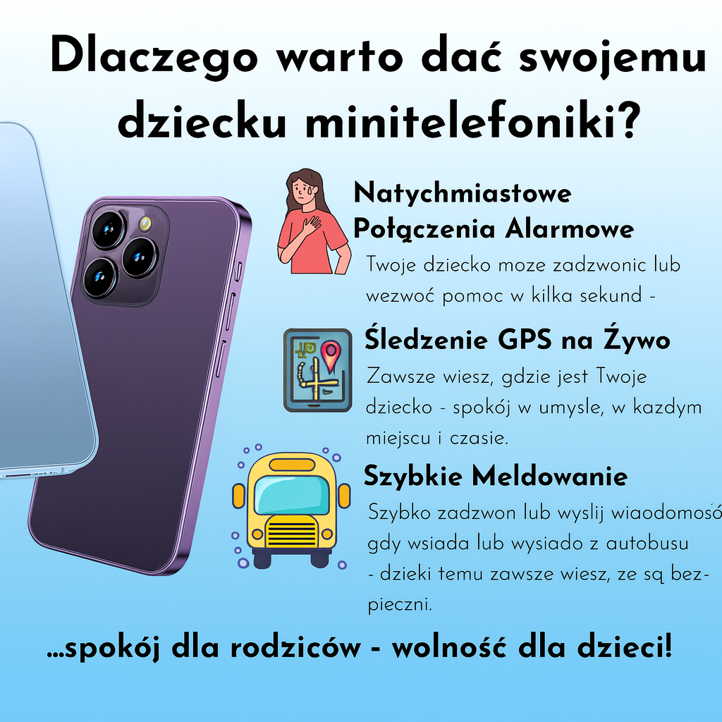 MiniTelefonik oferuje tylko to, co najważniejsze: połączenia, wiadomości, GPS i aplikacje, które sam zatwierdzisz.Mniej ekranu, więcej bezpieczeństwa — i stały kontakt z Tobą.